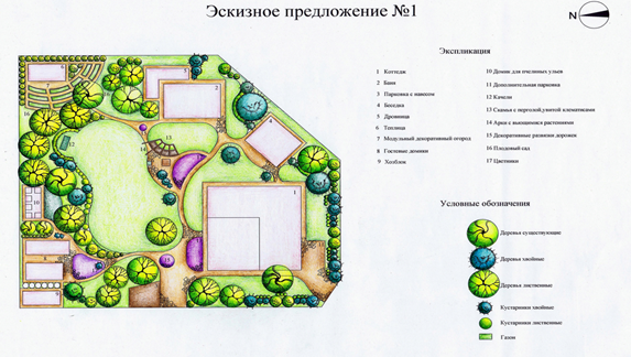 Основываясь на полученной информации, дизайнер-проектировщик должен разработать два эскизных предложения в разных стилях. В этих эскизах нужно грамотно использовать теневые и солнечные зоны, то есть создать правильное зонирование территории, с учетом всех особенностей ландшафта. Следует расположить дорожки и площадки таким образом, чтобы они были функциональными, соединяли все спроектированные зоны отдыха с основными зданиями и сооружениями. Мощение дорожек должно быть не только красивым, но и удобным в эксплуатации.
